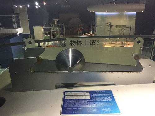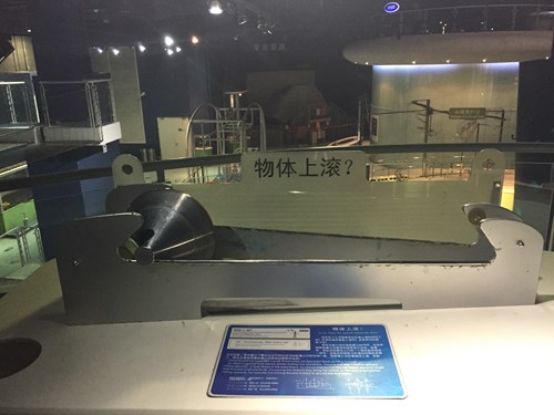 本展品由双锥体和倾斜轨道组成。操作时,观众可将双锥体放置于轨道的高处,双锥体并不从高处滚向低处;如果将双锥体放置于轨道的低处,双锥体却能从低处滚向高处。
