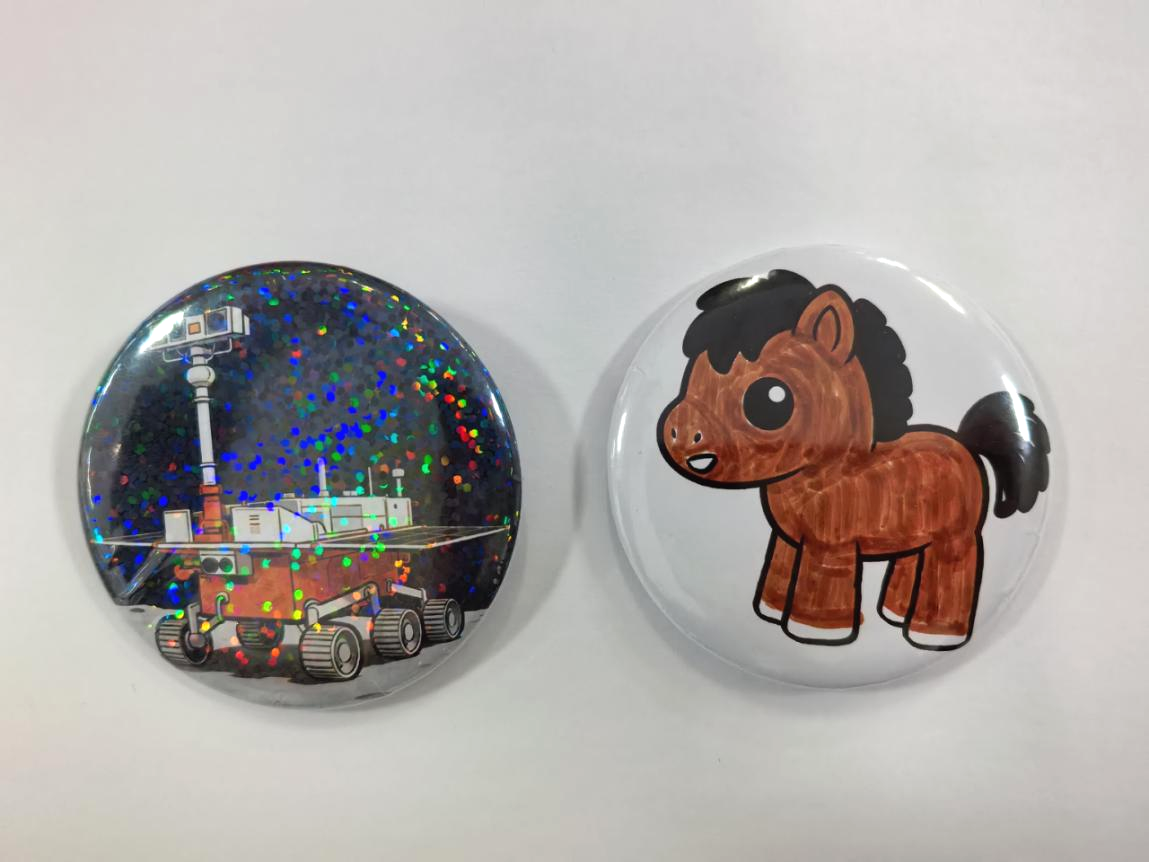 活动现场提供制作徽章的工具和材料,观众可以领取卡通小马线描纸,现场涂色、制作创意徽章。