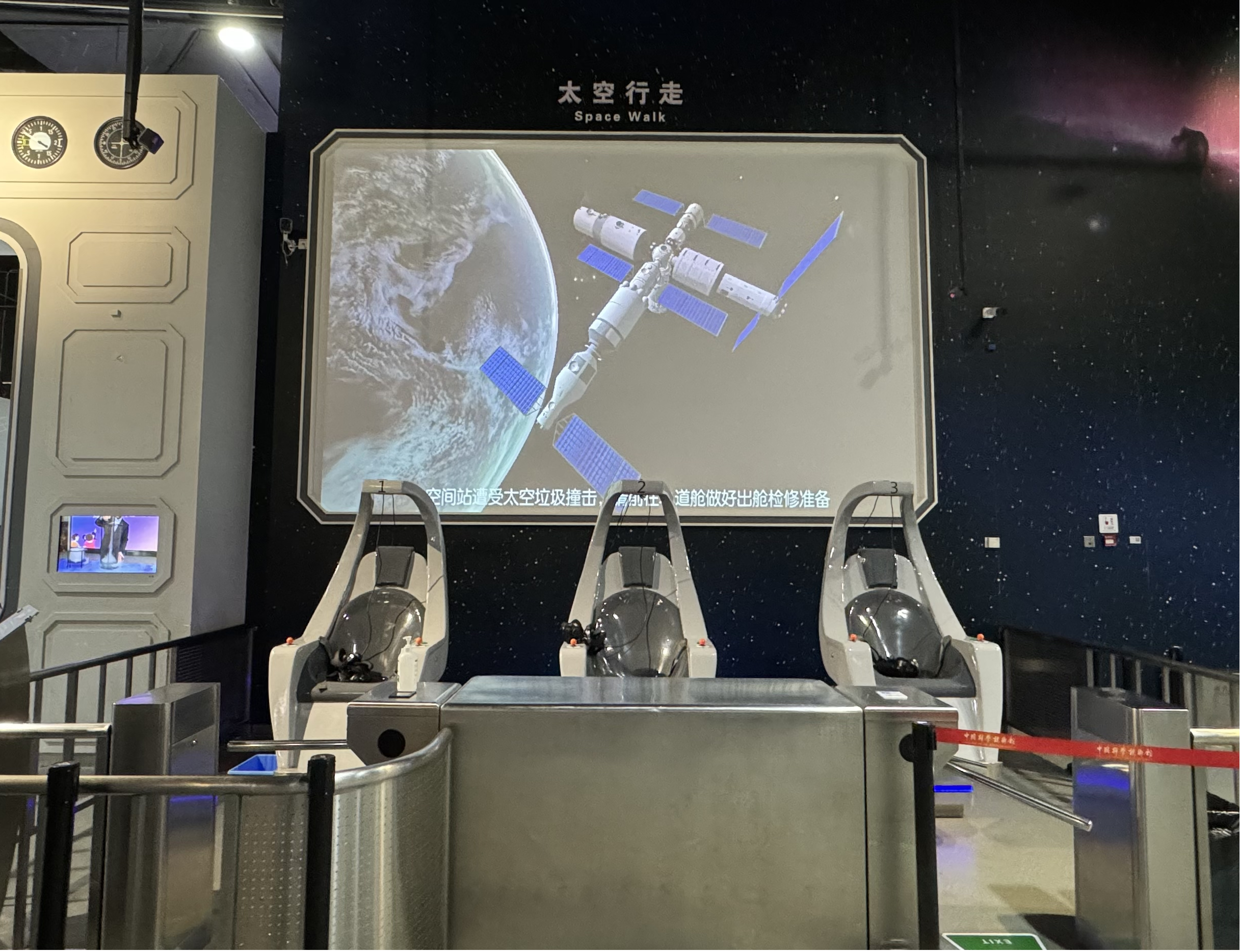 活动简介:该展品借助VR眼镜和电动座椅营造太空行走的模拟场景,让观众以第一视角体验航天员离开太空舱进入太空行走的过程。